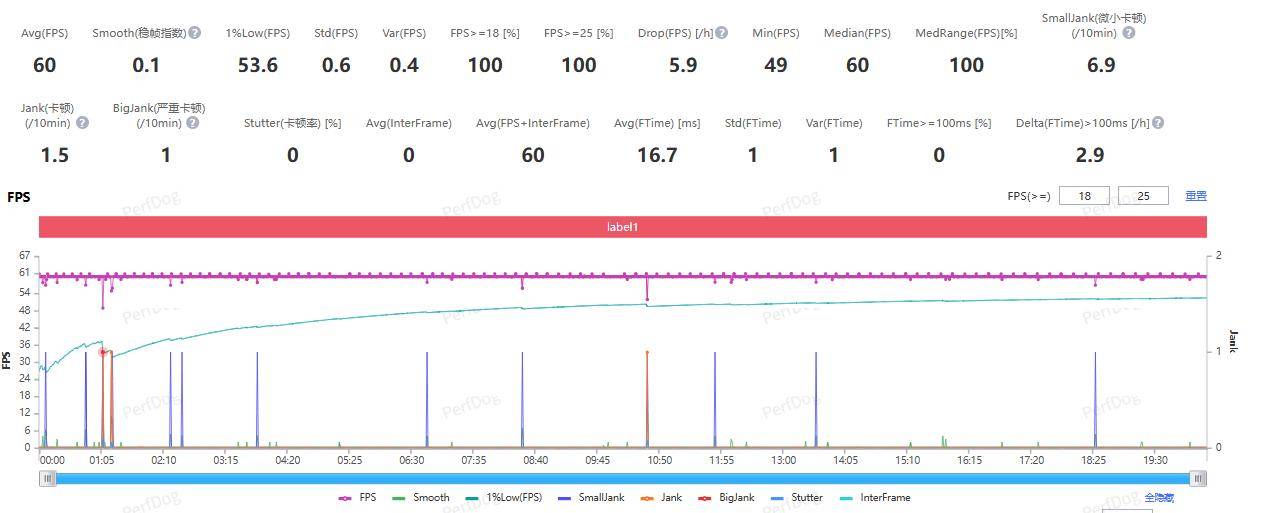 跑图 10 分钟后,测得游戏运行平均帧率为 60 FPS,整个过程也没有遇到卡顿掉帧的情况,帧率曲线上几乎没什么波动。